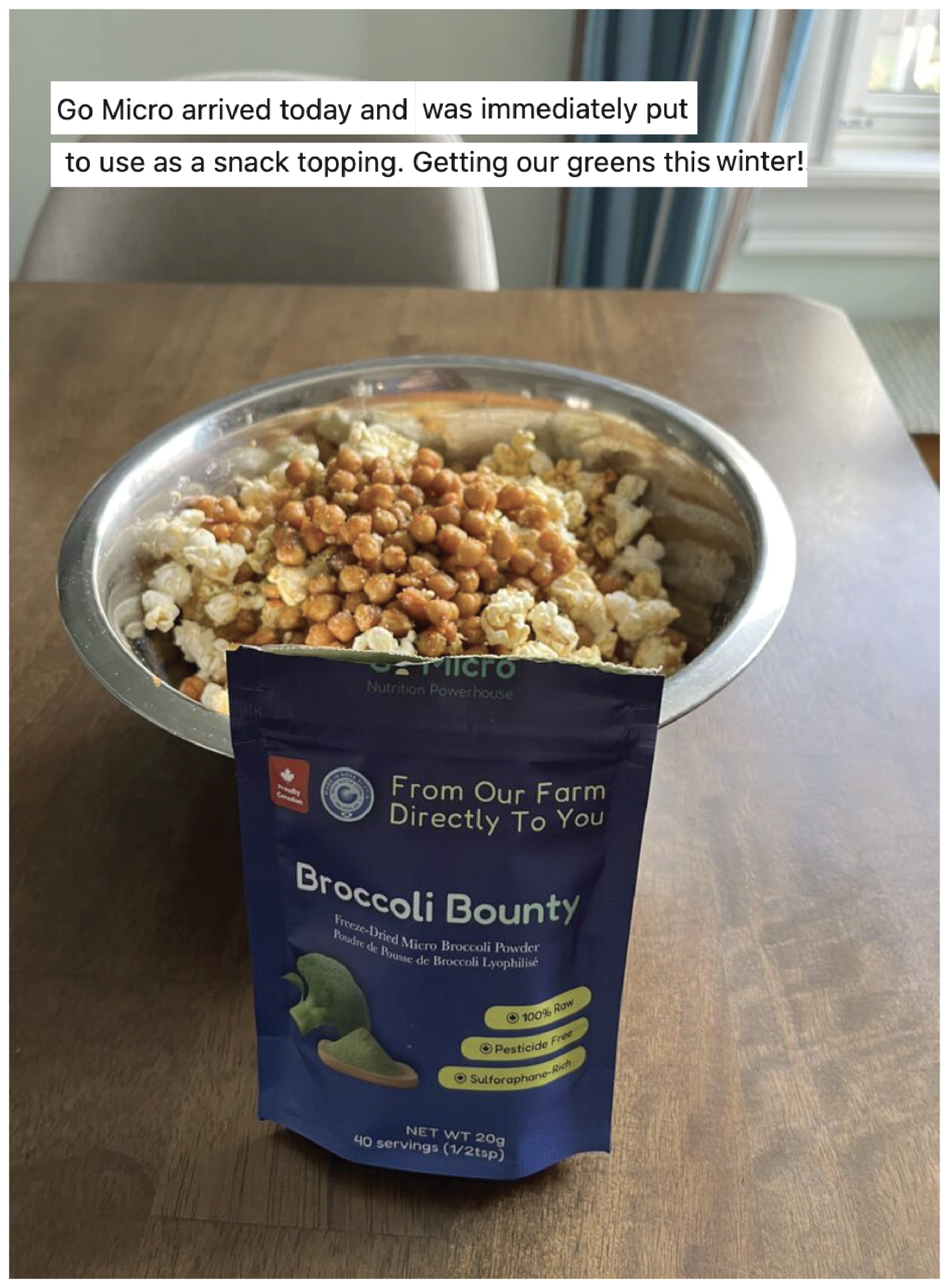 GoMicro is afood based product, not a synthetic supplement. It is made from whole broccoli microgreens grown and processed on our farm, then gently freeze dried into powder form. We focus on food you can eat daily, not pills, capsules, or detox programs.